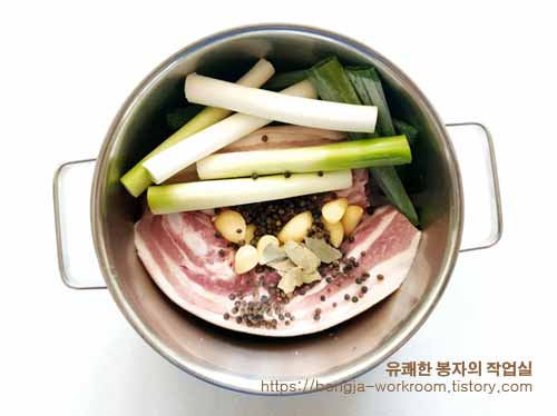 오겹살 1kg, 대파 2대, 통마늘 15알, 통후추 30알, 월계수 잎 2장(생략 가능)